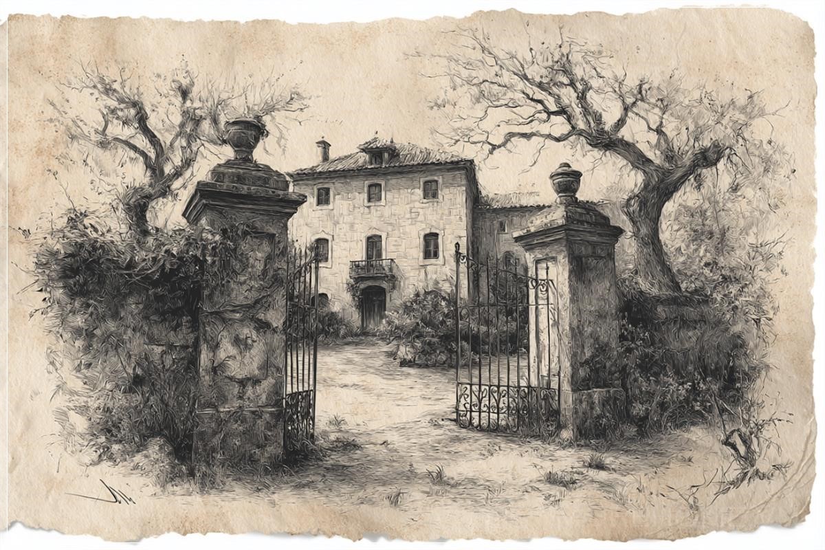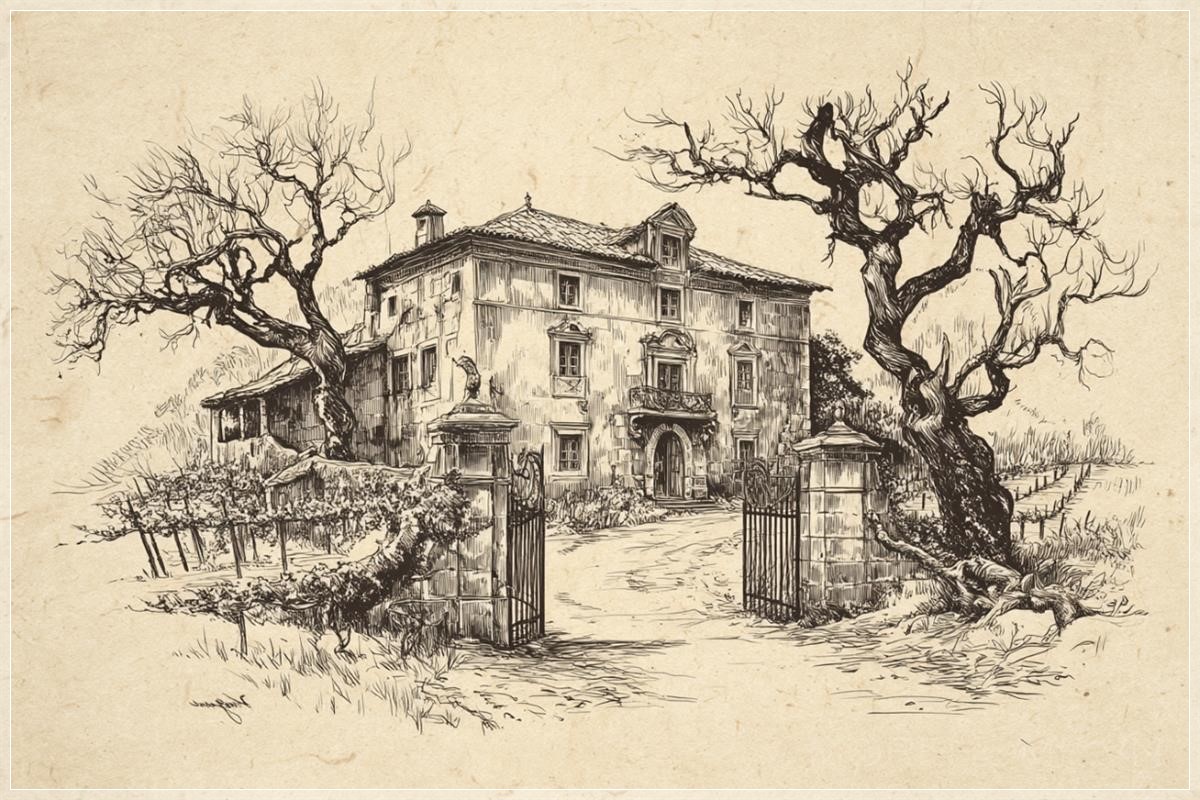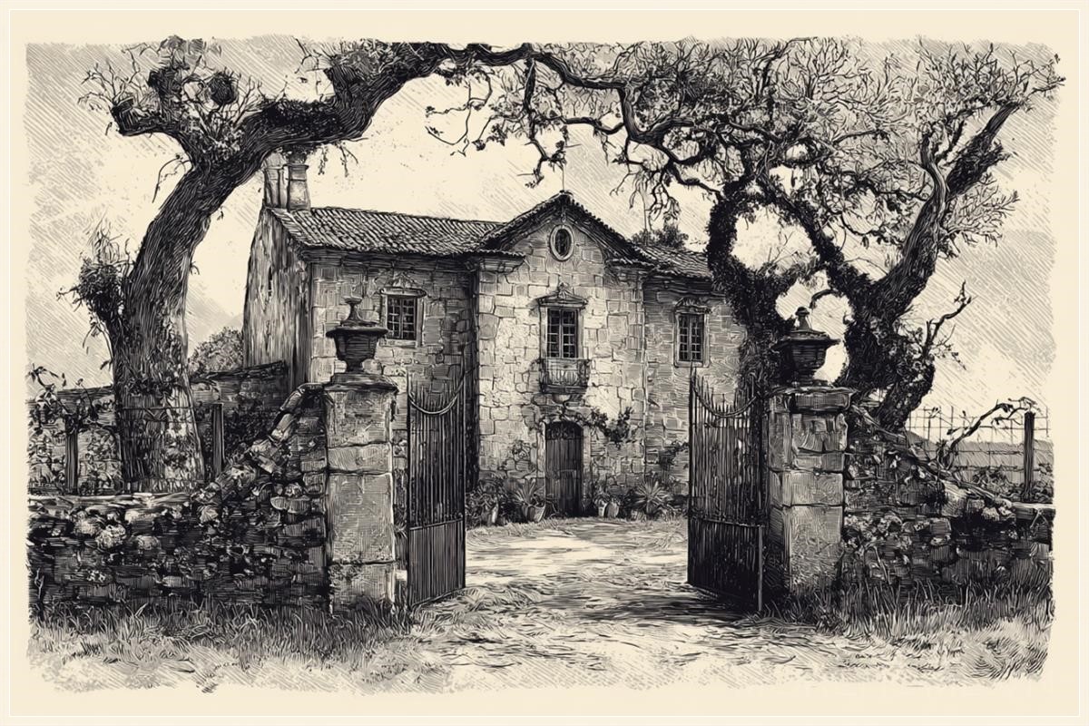 Phong cách khắc họa cổ điển trong từng đường nét của tòa pazo này gợi nhớ đến những bức tranh minh họa vintage trên những nhãn rượu vang cao cấp. Kỹ thuật khắc tỉ mỉ tái hiện từng viên đá, từng kẽ nứt trên tường, từng chiếc lá nho khô héo, tạo nên một tác phẩm nghệ thuật hoàn hảo cho những người sành rượu vang.