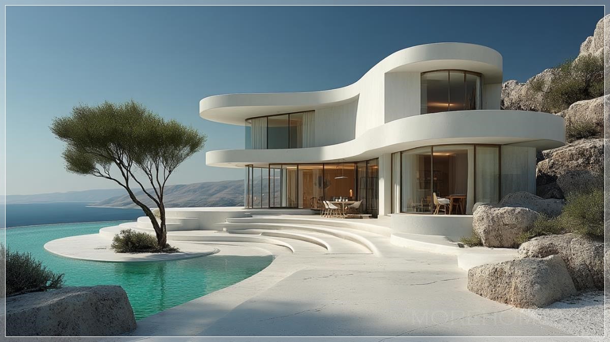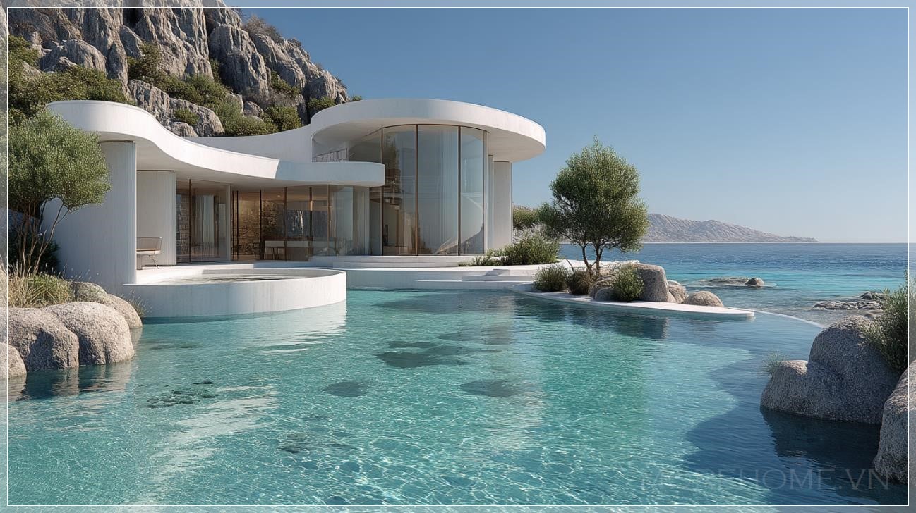 Lấy cảm hứng từ thế giới khoa học viễn tưởng và nghệ thuật bắt chước sinh học, villa này nổi bật với kiến trúc màu trắng tinh khôi, những đường nét mềm mại như được tạo hình bởi gió biển và thời gian. Các lớp hình học chính xác xếp chồng lên nhau một cách thơ mộng, tạo nên cấu trúc được nâng cao phía trên những khối hình trụ kính trong suốt - một thiết kế táo bạo nhưng vẫn giữ được sự thanh lịch đặc trưng của kiến trúc Địa Trung Hải.