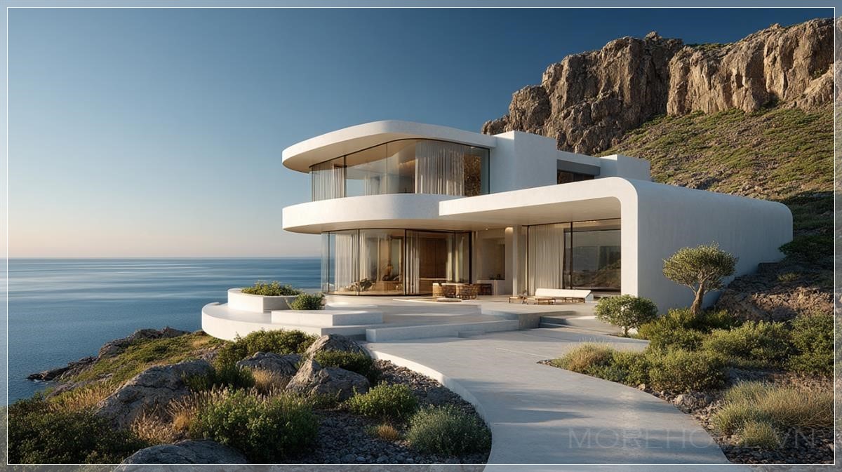 Triết lý thiết kế của villa xoay quanh khái niệm "slow living" - cuộc sống chậm rãi, nơi mọi chi tiết đều được tính toán để mang lại cảm giác thư thái và cân bằng. Các đường cong mềm mại của tòa nhà không chỉ tạo nên vẻ đẹp thẩm mỹ mà còn phản ánh dòng chảy tự nhiên của gió biển và sóng nước. Mỗi góc cạnh đều được làm tròn, mỗi bề mặt đều được xử lý một cách tinh tế để tạo nên cảm giác như villa này đã tồn tại ở đây từ muôn đời.