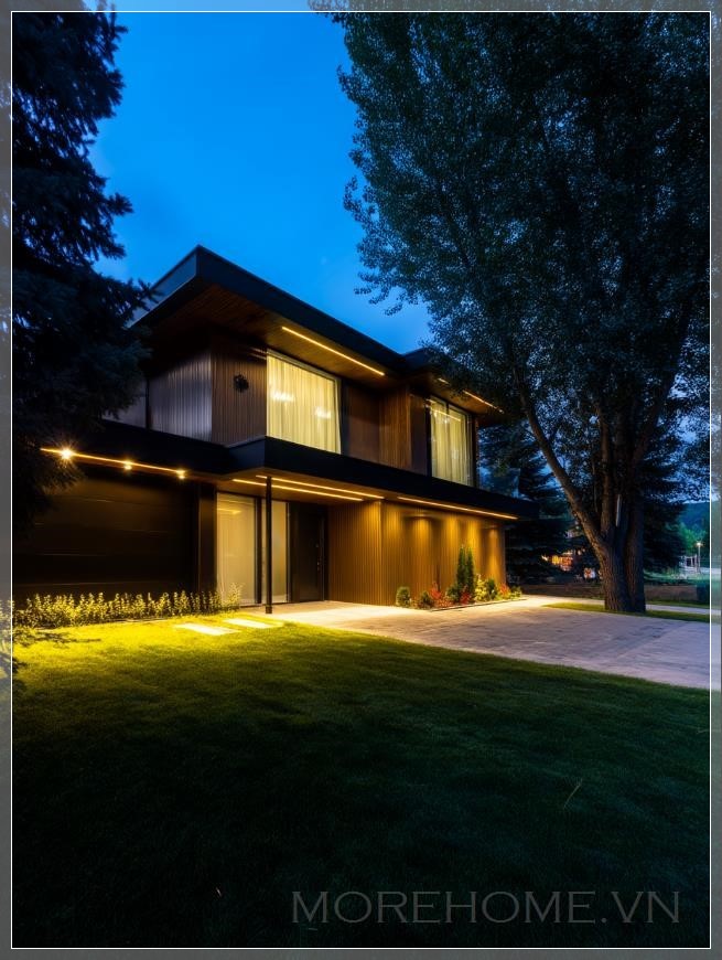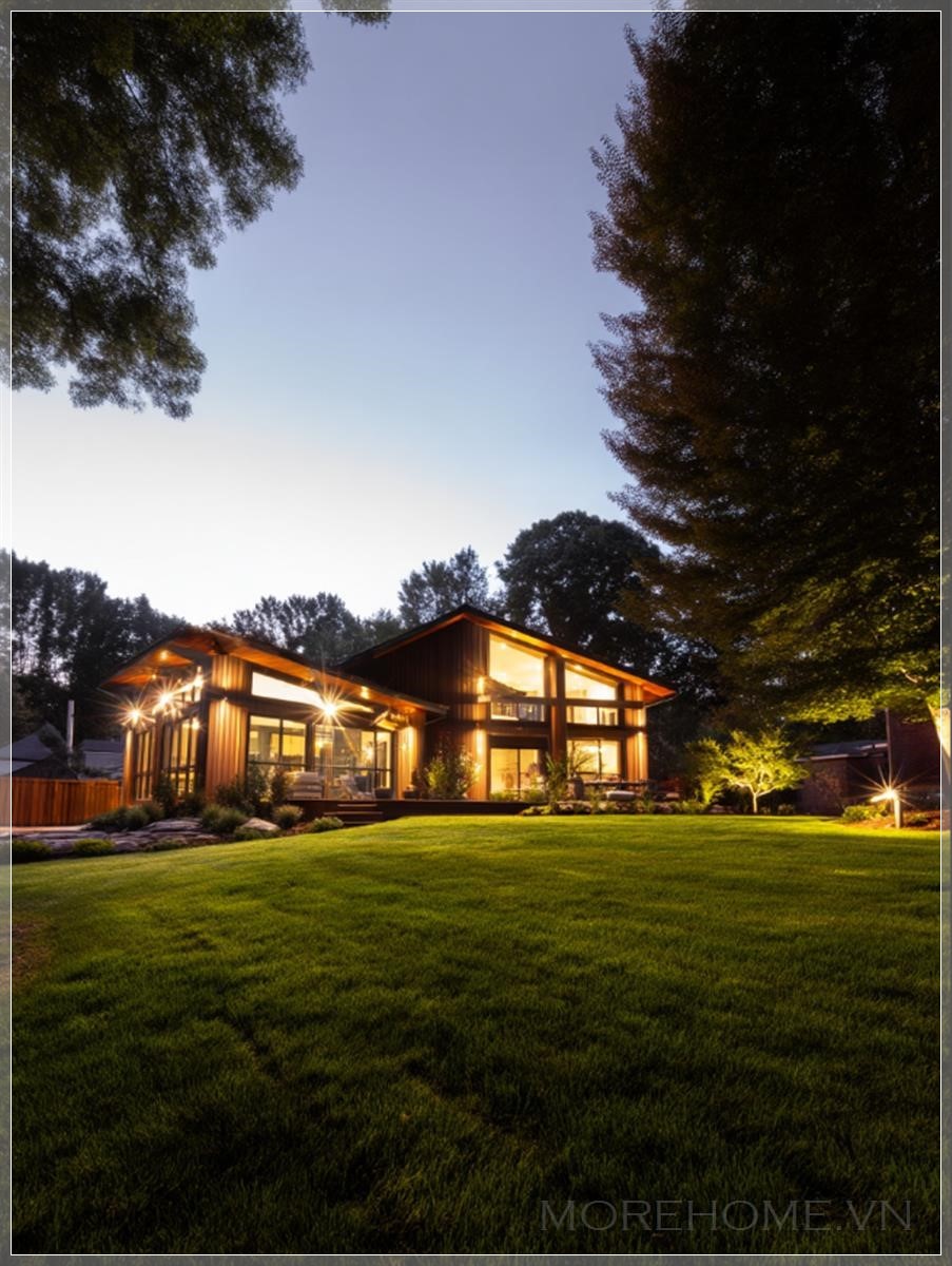 Xung quanh ngôi nhà, thảm cỏ xanh mướt và những cây cối tươi tốt được ánh sáng nhẹ nhàng vuốt ve, tạo ra một khung cảnh như trong truyện cổ tích. Màu xanh của thiên nhiên và ánh vàng ấm của đèn LED tạo nên sự cân bằng màu sắc hoàn hảo, vừa năng động vừa yên bình.