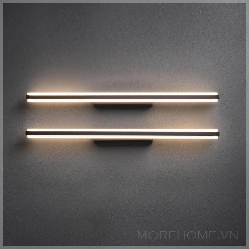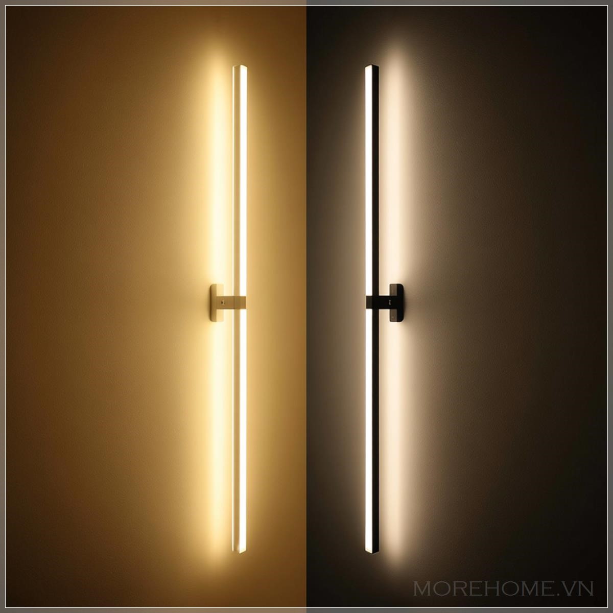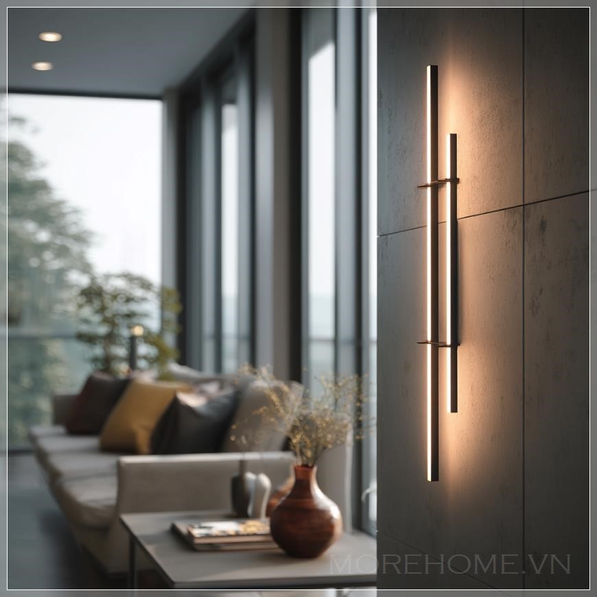 Hình ảnh hai dải sáng LED song song, được ôm trọn trong khung kim loại đen mờ, tạo nên một tác phẩm nghệ thuật ánh sáng đầy mê hoặc. Thiết kế tuyến tính này không chỉ mang lại hiệu ứng thị giác ấn tượng mà còn tối ưu hóa việc phân bố ánh sáng trong không gian. Khi được lắp đặt trên tường phòng khách, nó tạo ra những dải sáng mềm mại, vừa đủ để tạo không khí ấm cúng nhưng không quá chói lòa.