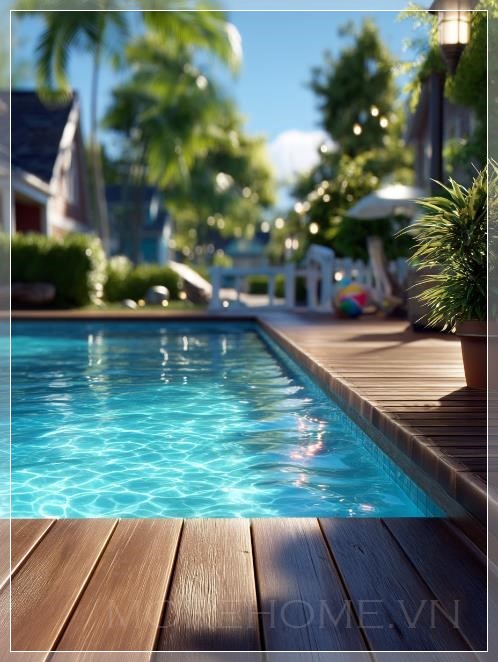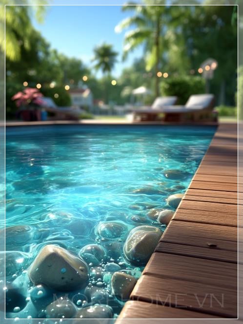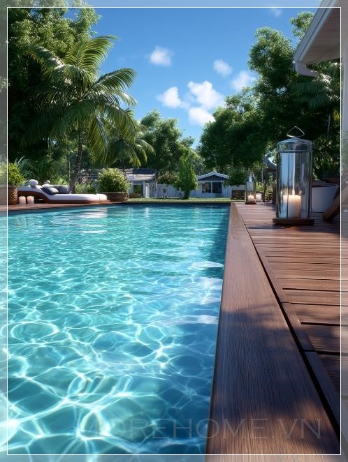 Đây là khoảnh khắc mà thời gian như ngừng trôi. Không có tiếng ồn ào của thành phố, không có bóng dáng người qua lại, chỉ có âm thanh nhẹ nhàng của làn gió thổi qua và tiếng nước chảy êm ái từ hệ thống lọc hồ bơi. Những tấm ván gỗ dưới chân, được nắng ướp qua nhiều mùa, toát lên hương thơm đặc trưng của gỗ tự nhiên - một mùi hương quen thuộc mà ấm cúng.