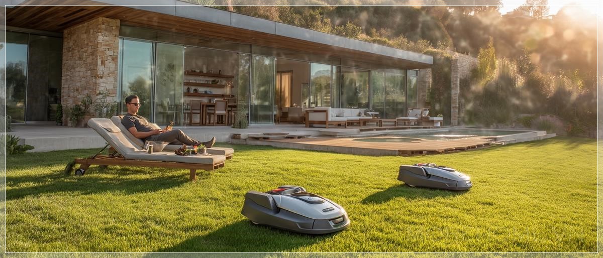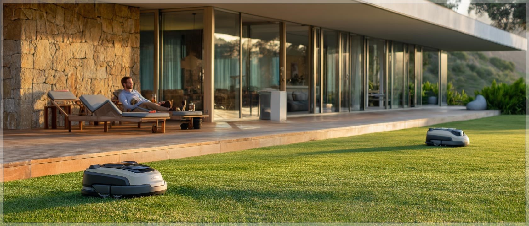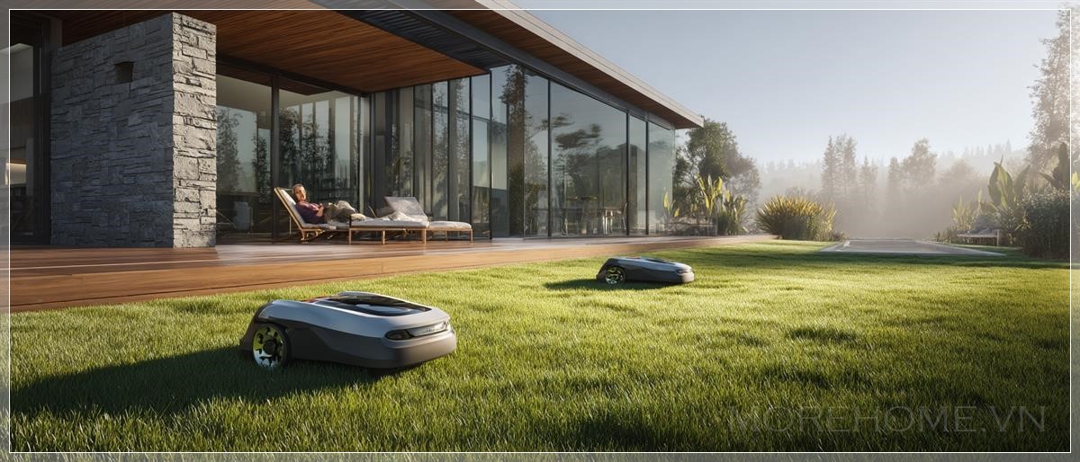 Hãy tưởng tượng một buổi sáng sớm mùa hè, khi ánh nắng nhẹ nhàng chiếu xuống một khu vườn sang trọng, với một ngôi nhà hiện đại nằm ẩn mình dưới những cửa sổ kính lớn. Trong không gian này, hai chiếc máy cắt cỏ tự động đang vận hành, lướt qua thảm cỏ xanh mướt, mang đến sự tự động hóa tối ưu mà không làm gián đoạn vẻ đẹp tự nhiên của khu vườn. Bức tranh này không chỉ thể hiện một không gian sân vườn mà còn là minh chứng cho sự kết hợp hài hòa giữa công nghệ, thiết kế hiện đại và sự thoải mái tinh tế. Sự hiện diện của các chi tiết như sàn gỗ tự nhiên và đá tự nhiên không chỉ mang đến một vẻ ngoài sang trọng mà còn tạo ra cảm giác gần gũi với thiên nhiên.