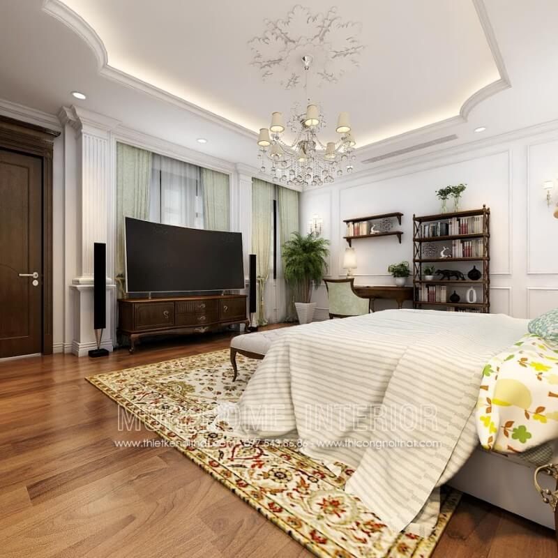 Một gợi ý tuyệt vời cho căn phòng ngủ biệt thự tân cổ điển với mẫu kệ tivi gỗ tự nhiên sang trọng, đường nét tinh tế, ấn tượng