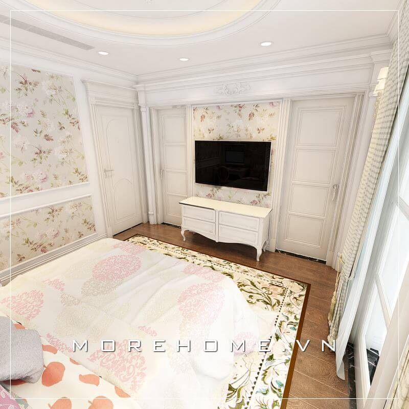 Một góc nhìn khác về chiếc kệ tivi trắng pha chút họa tiết vàng đậm chất hoàng gia cho căn phòng ngủ tân cổ điển