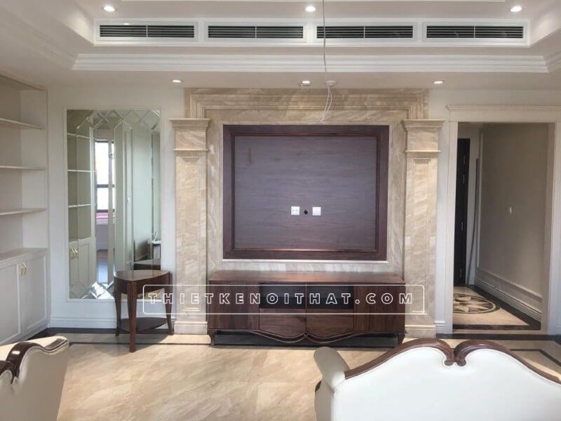 Hình ảnh thực tế của công trình nội thất phòng khách tân cổ điển đẹp cao cấp tại chung cư Vinhomes Nguyễn Chí Thanh, quận Đống Đa, Hà Nội đã hoàn thành.