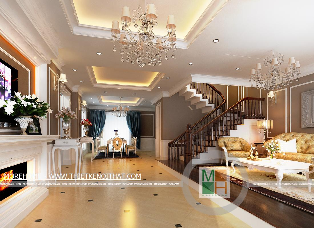 Trong không gian này, các KTS Morehome đã thiết kế mang phong cách Pháp đồng bộ với phong cách ngoại thất công trình do chính công ty thiết kế. Một điều chắc chắn là bạn sẽ phải choáng ngợp khi bước vào gian phòng khách siêu rộng với những chi tiết vô cùng đẹp và quyến rũ của phong cách Pháp này. Vẻ đẹp kiến trúc của thiết kế biệt thự cổ điển này còn được thể hiện qua phối cảnh cầu thang kiểu lâu đài.