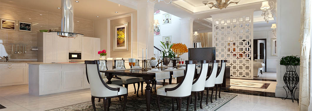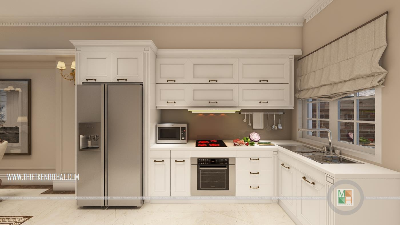 Khu vực nhà ăn của biệt thự được KTS Morehome sử dụng màu sắc nhã nhặn làm tông màu chủ đạo, tạo cho không gian nơi đây một cảm giác ấm áp sang trọng. Một đặc trưng khác đó chính là việc thể hiện sự sang trọng qua những đường nét thiết kế biệt thự tỉ mỉ và khá cầu kỳ tại đây.